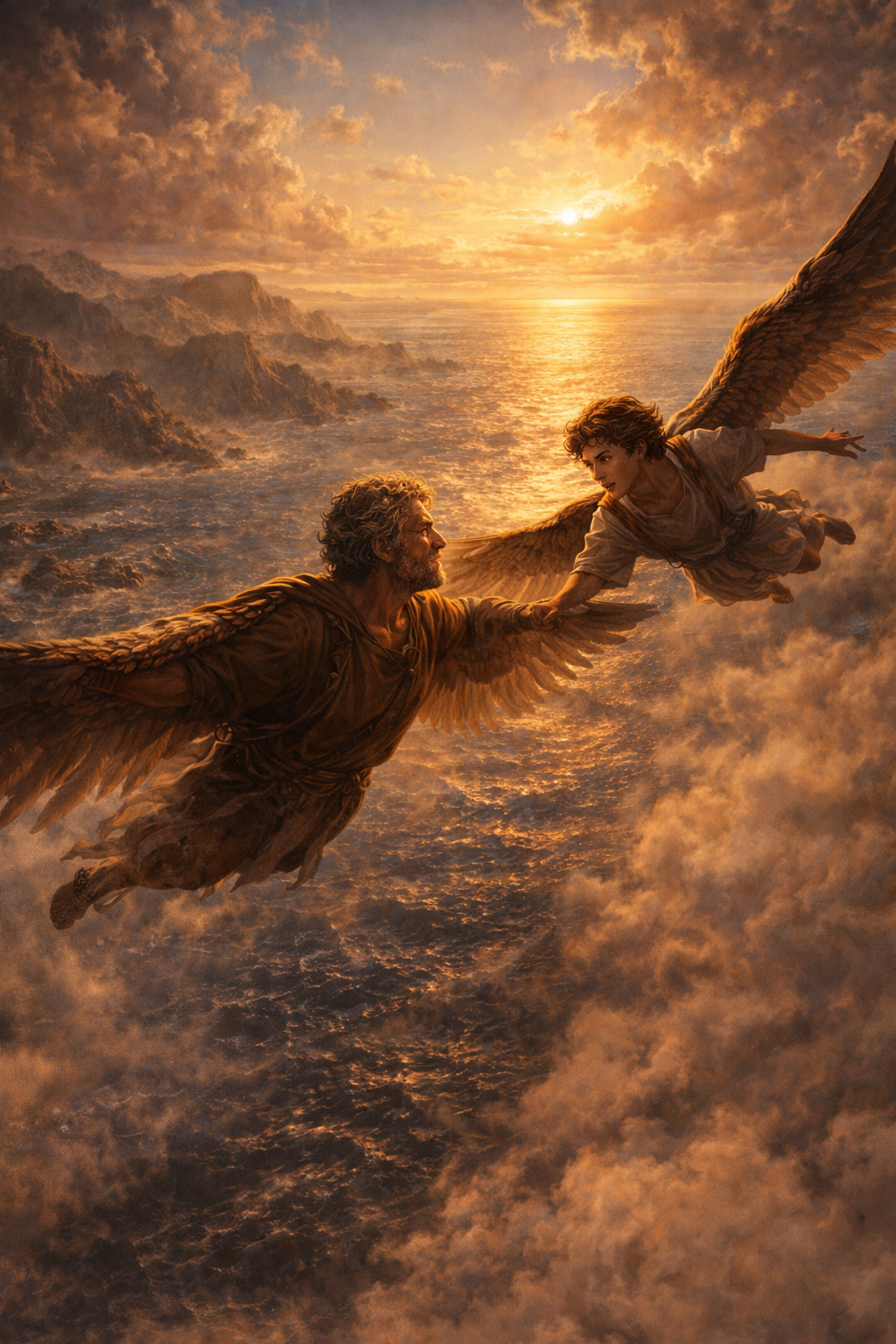 다이달로스는 아들을 향해 미소를 지었습니다. 모든 것이 계획대로였습니다. 그들은 크레타를 떠나, 자유로운 땅을 향해 날아가고 있었습니다.