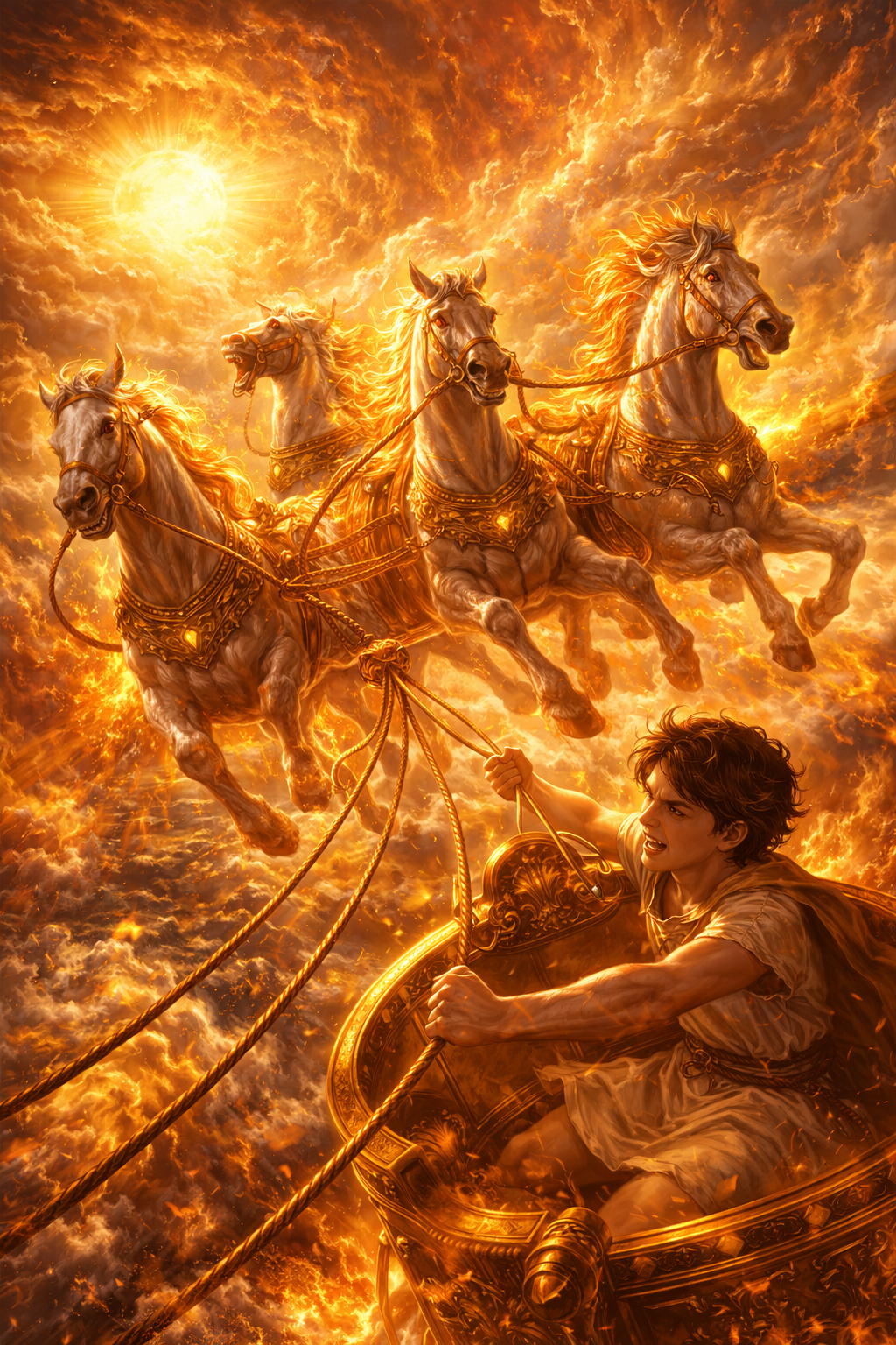 파에톤은 고삐를 잡았습니다. 하지만 그의 손은 떨렸고, 힘은 부족했습니다. 말들은 그를 비웃듯이 더 거칠게 달렸습니다.