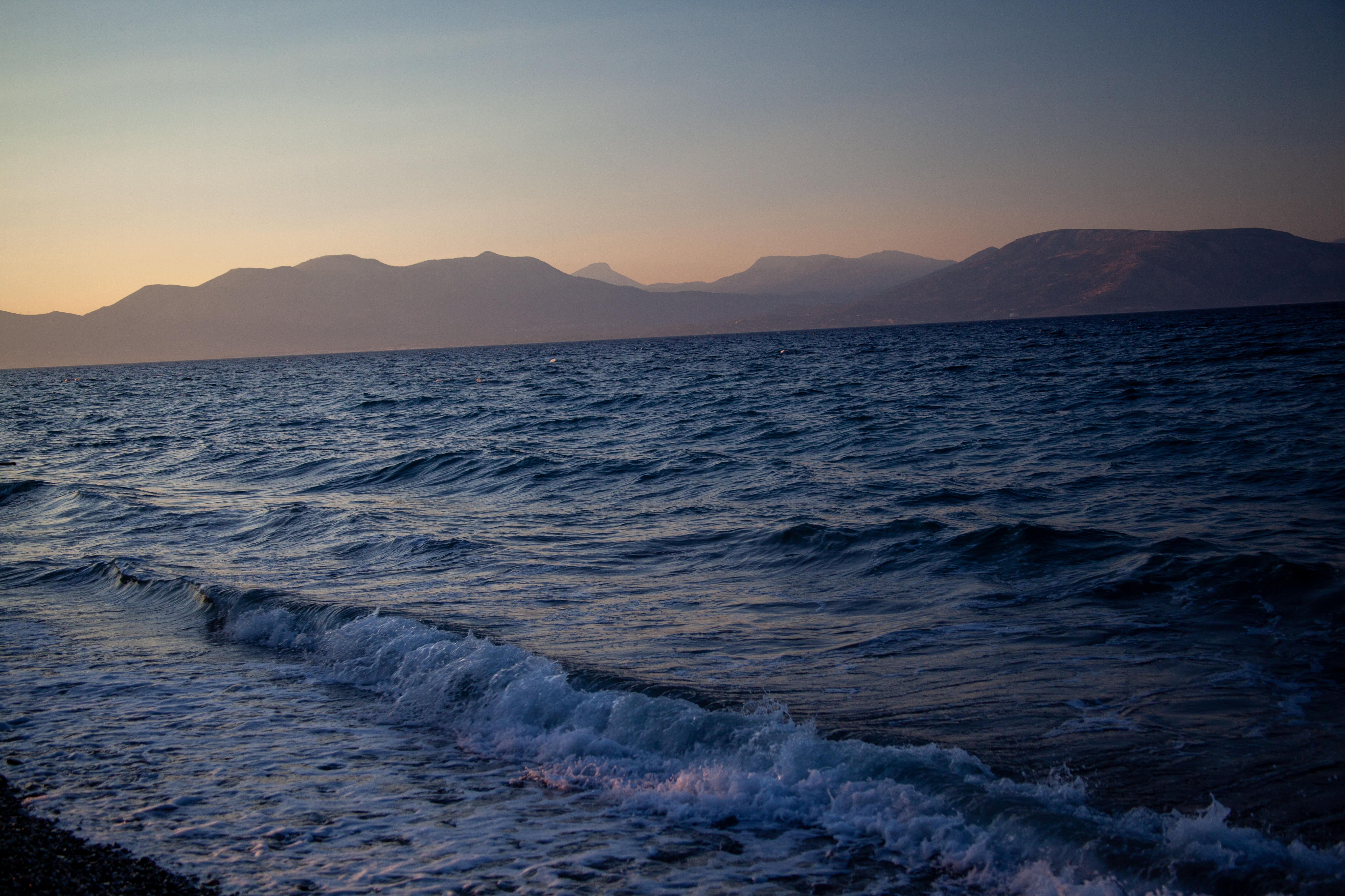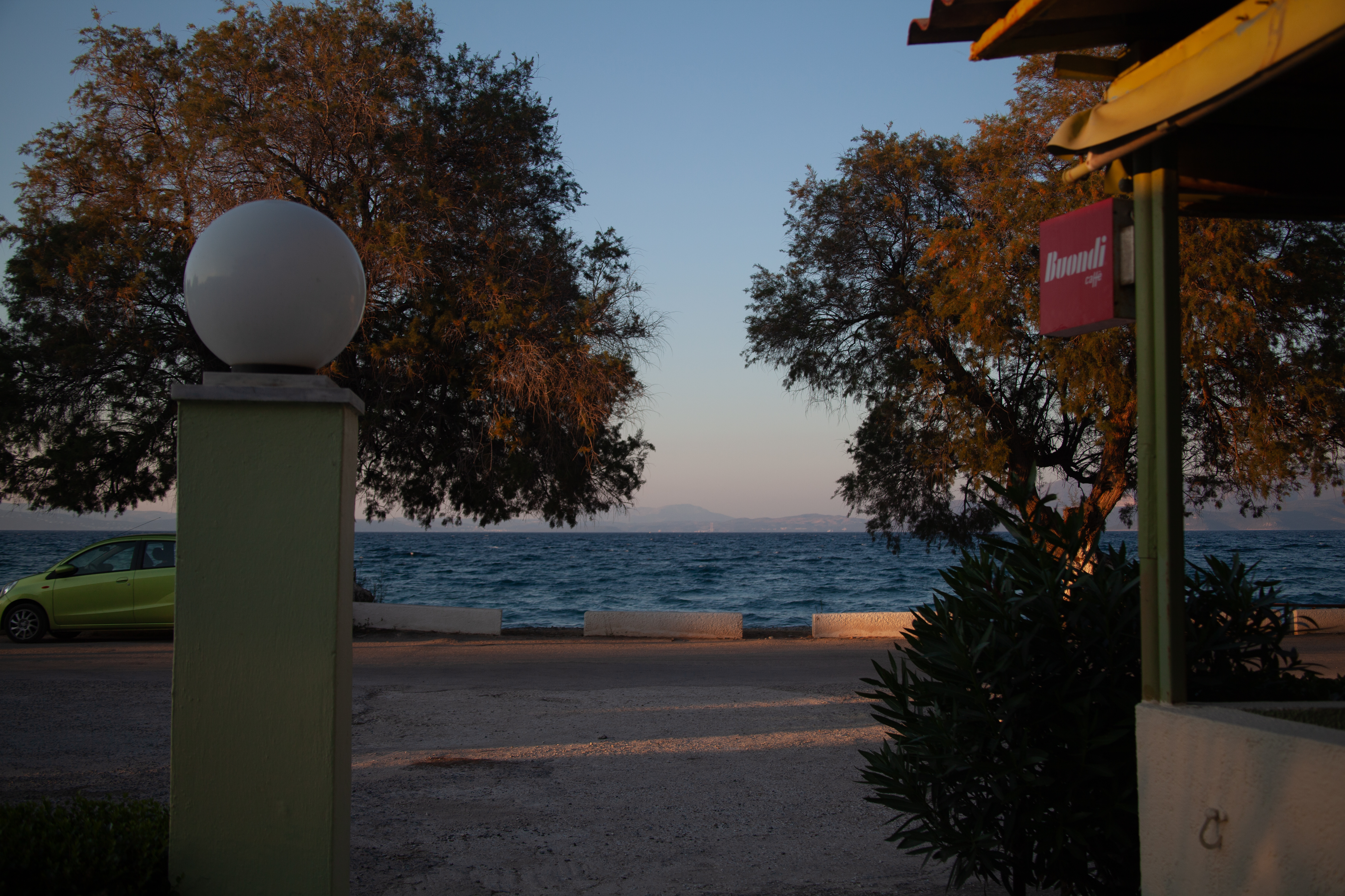 어두워지기 시작하는 바닷가에 벤치가 하나 있어 앉았습니다. 바다 건너 보이오티아(Boeotia) 지방이 보입니다.
