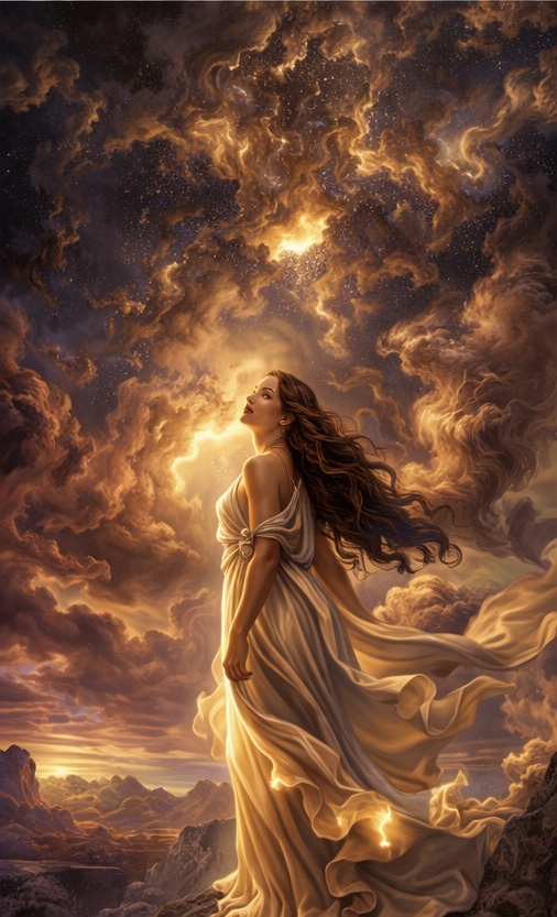그때, 서풍이 부드럽게 그녀를 들어올렸습니다. 프시케는 계곡 아래 펼쳐진 황금 궁전 앞에 내려졌습니다.