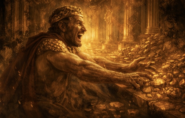 마이다스 왕은 디오니소스에게 "만지는 모든 것이 황금이 되는" 소원을 빌었습니다. 소원은 이루어졌습니다. 하지만 음식도, 와인도 황금이 되어 — 먹을 수도 마실 수도 없게 되었습니다.