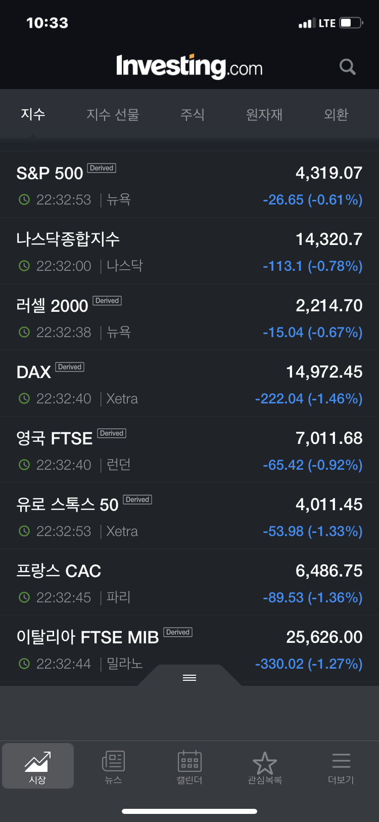 유럽증시도 거의 모두 2%씩 폭락했다. 이제 밤 11시가 넘으면 미국 증시가 개장할 것이다. 추락하는 것은 날개가 있다던가?