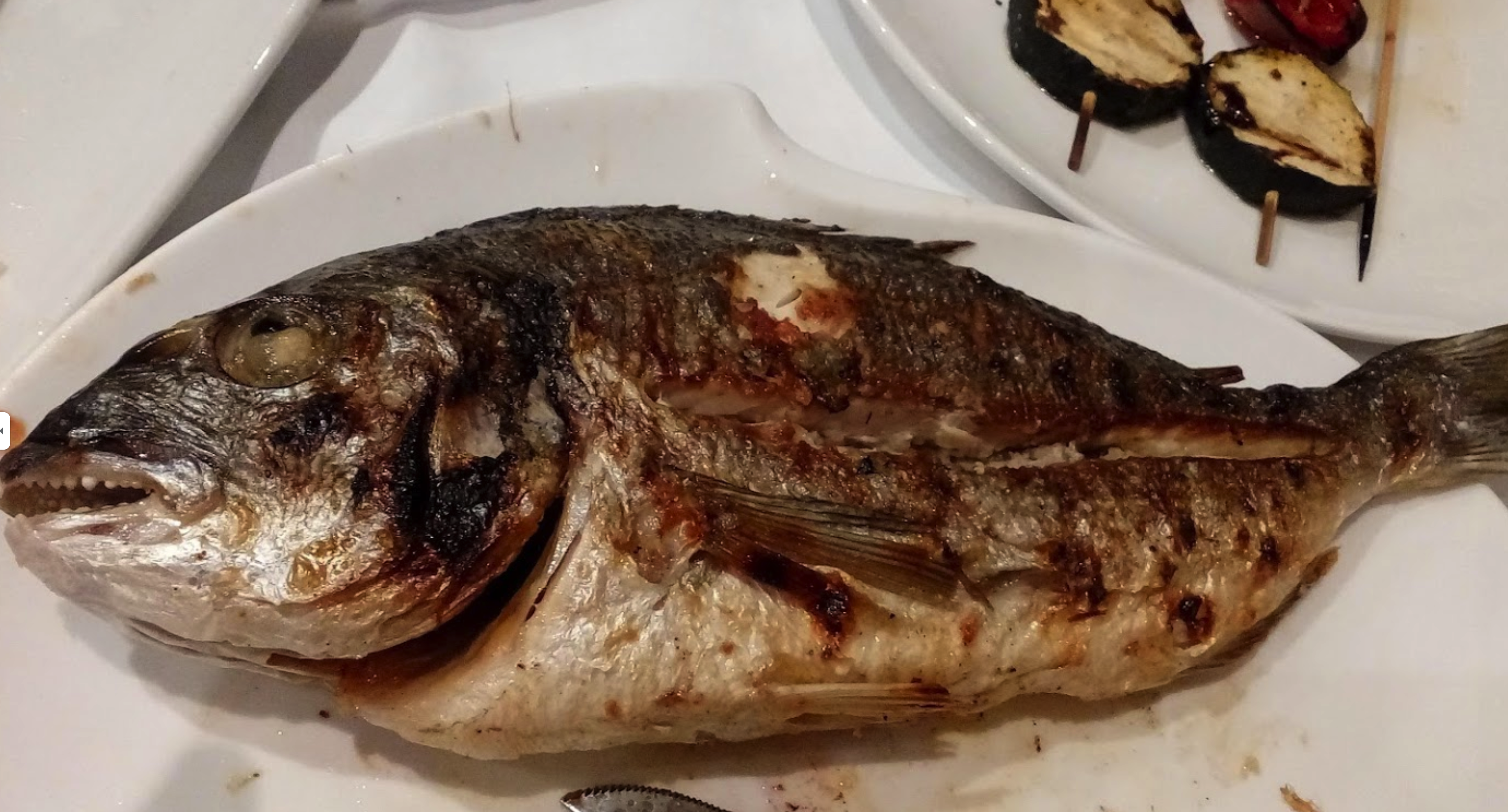 트로기르에서도 즐겨 먹었던 생선구이와 스프를 시켰다. 생선은 감성돔처럼 보이는 sea bream. 도미 종류인데 그릴에 구운 생선살만 먹어도 배가 찬다. 구운 야채와 해산물 수프도 역시 일품...