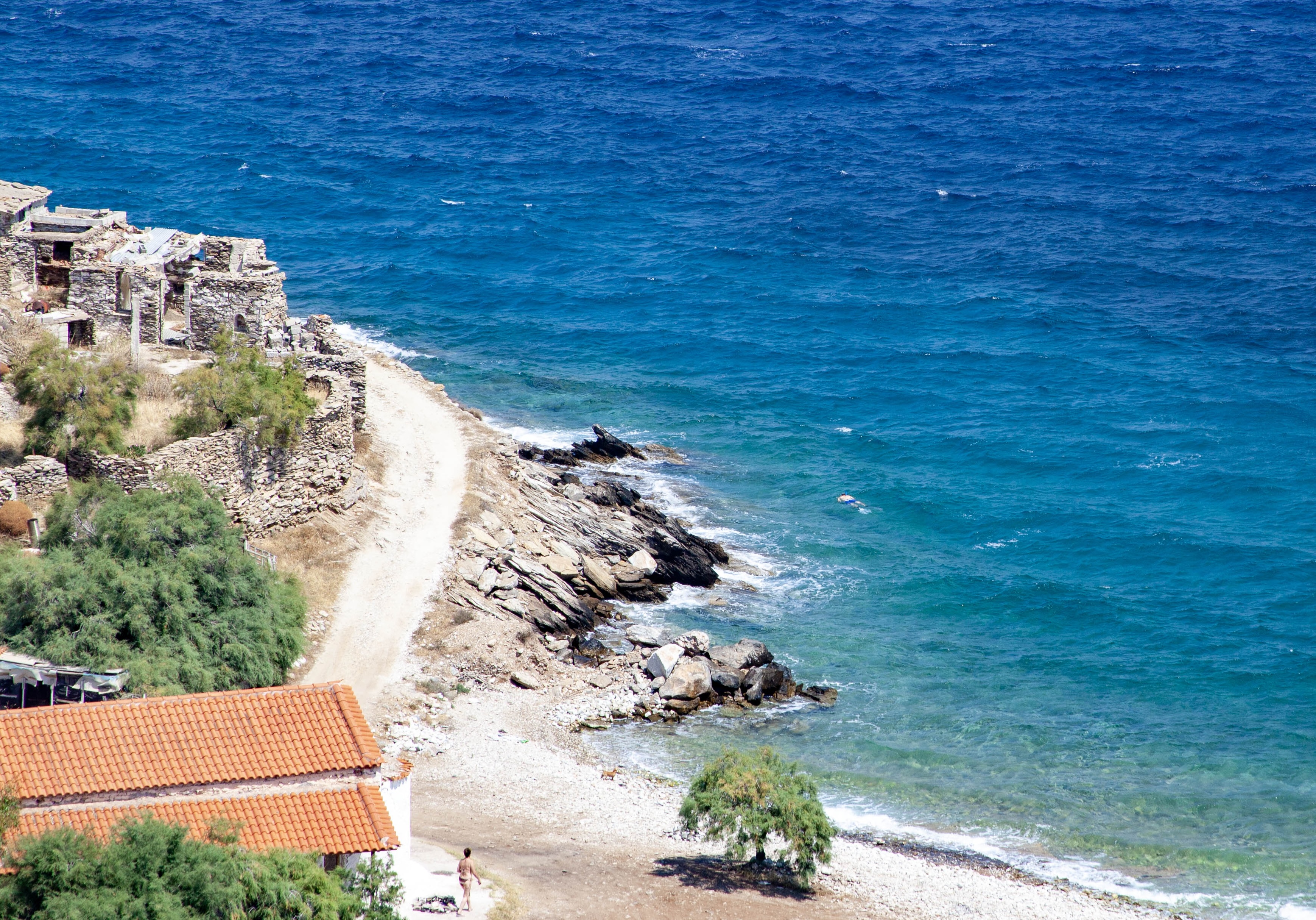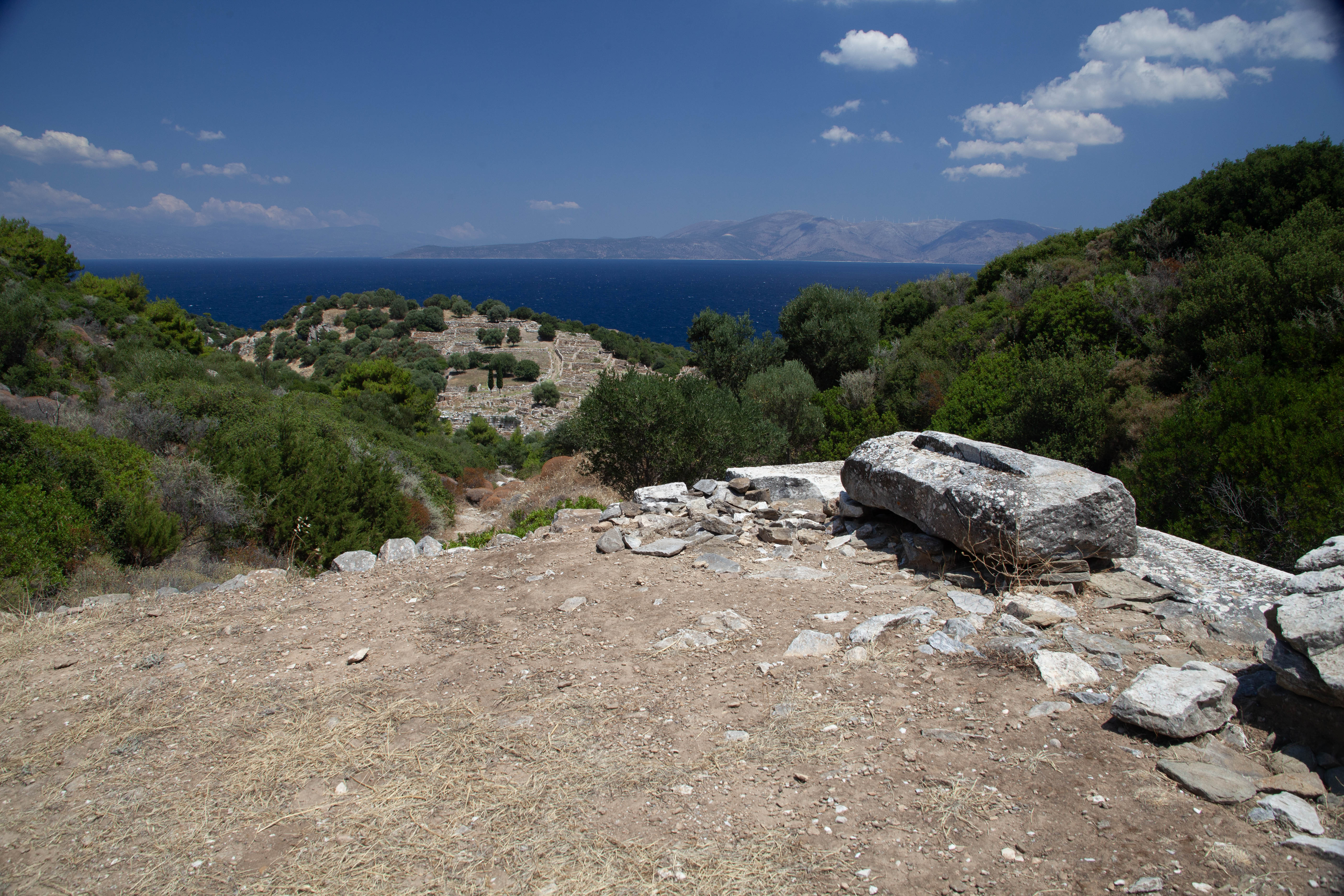램노스 근처에 앵커를 내리고 상륙해서 고대 유적을 살펴보았다. 유적 발굴을 위해 지은 작은 집에서 한 여인이 걸어나오고 그녀의 연인은 바다에서 유믈 탐사 스토클링을 하고 있었다. 바다와 하늘이 너무나 아름다운 색조를 띄운 날이다.