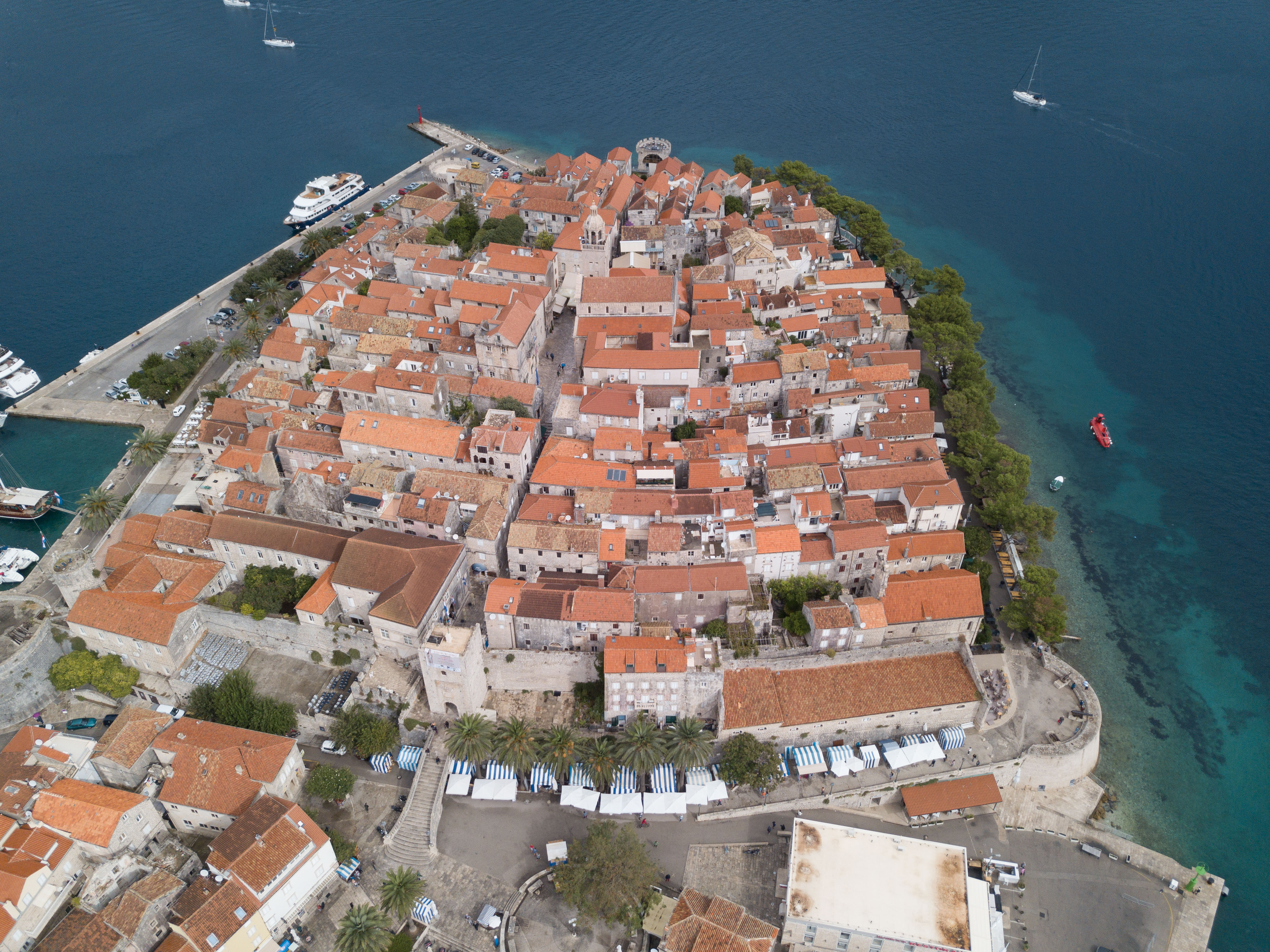 드론을 날려 마을을 하늘에서 보니 항구 한 켠에 원형 베네치아 방어 요새가 뚜렷이 보였다. 마을 뒤편은 급경사의 산이 위치했다. 그 위에서 내려다 보면 도시 전체가 한 눈에 들어온다.