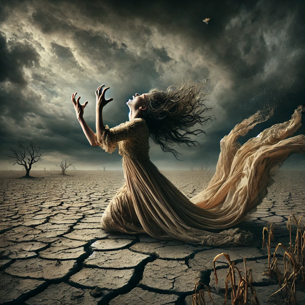 (데메테르가 천지를 돌아다니며 딸을 찾는다. 들판이 말라가고 땅이 점점 황폐해진다.)