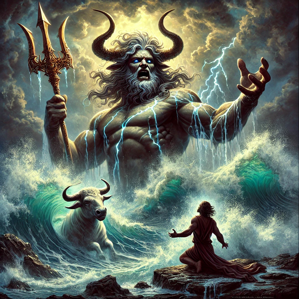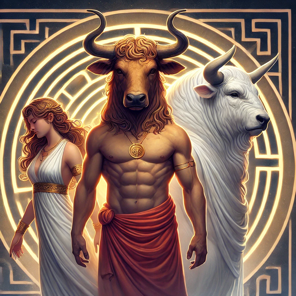 미노스 왕은 신들의 축복을 받아 하얀 황소를 선물받았다. 이 황소는 바다의 신 포세이돈이 보낸 신성한 존재였다. 미노스는 이 황소를 제물로 바쳐야 했으나, 황소의 아름다움에 반한 그는 이를 거부하고 대신 다른 황소를 바쳤다. 분노한 포세이돈은 복수의 계획을 세웠다. 미노스의 아내 파시파에가 황소에게 사랑에 빠지게 만든 것이다.
