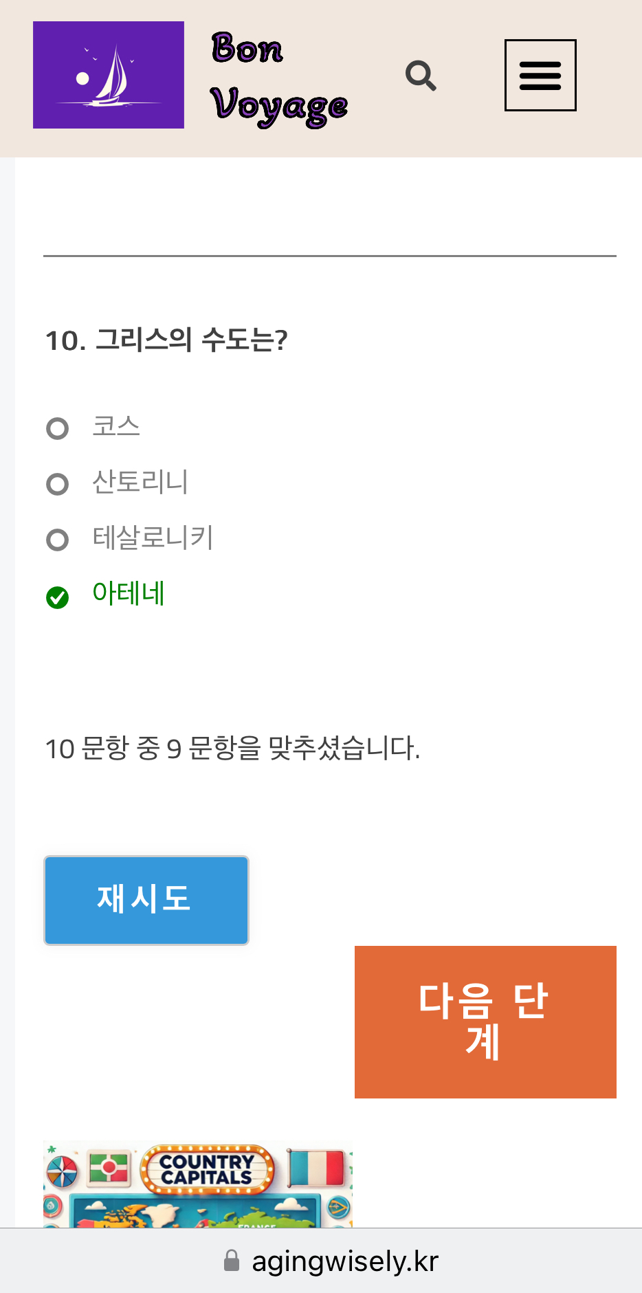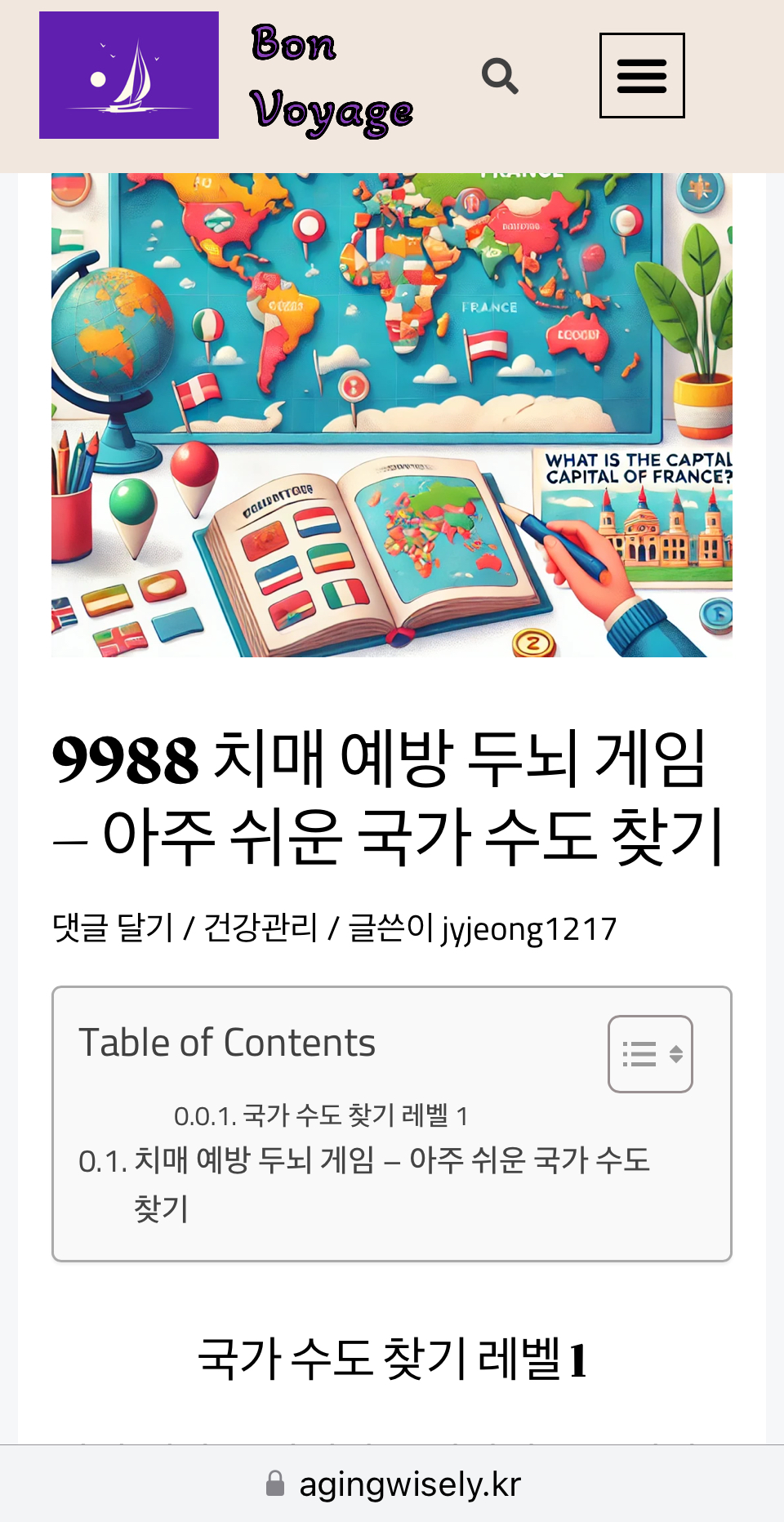 9988 치매 예방 두뇌 게임 - 아주 쉬운 국가 수도 찾기 - Bon Voyage