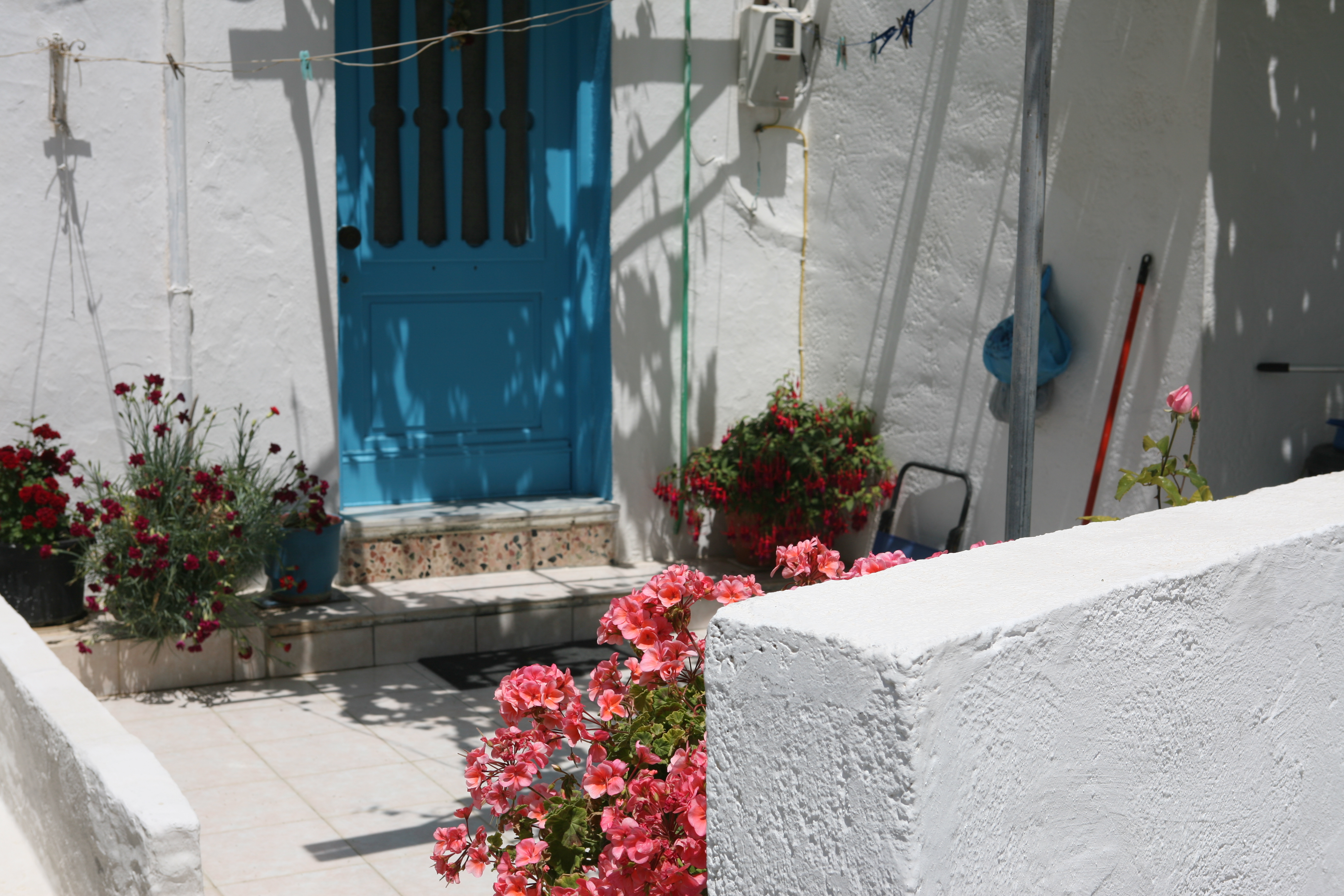 마을은 에게 해 섬들의 전형적인 색채를 따릅니다. 벽은 흰색, 현관문과 벽의 일부는 파란색.