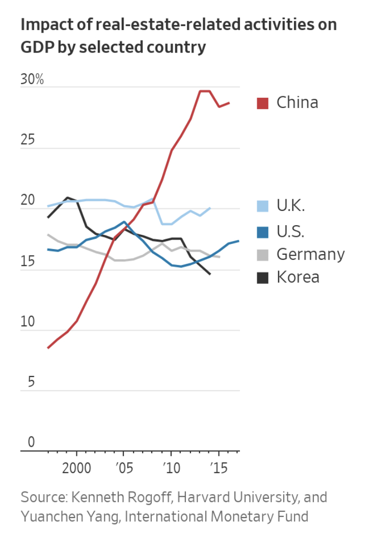 위 그래프는 GDP중 부동산의 비중을 국가별로 나타낸 것인데 중국은 30%에 육박한다. 그것도 2000년에는 다른 나라들보다 낮은 10%에서 급격히 상승한 것이다. 놀랍게도 한국은 15%에 불과하다.