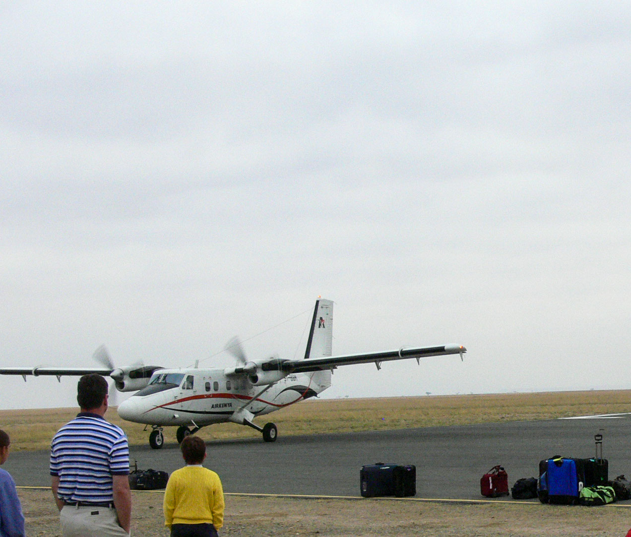 우리를 이곳에 데려다 준 프로펠러 비행기가 착륙을 하고 우리는 떠날 준비가 되었다. 활주로 너머로 누 한마리가 태연하다.