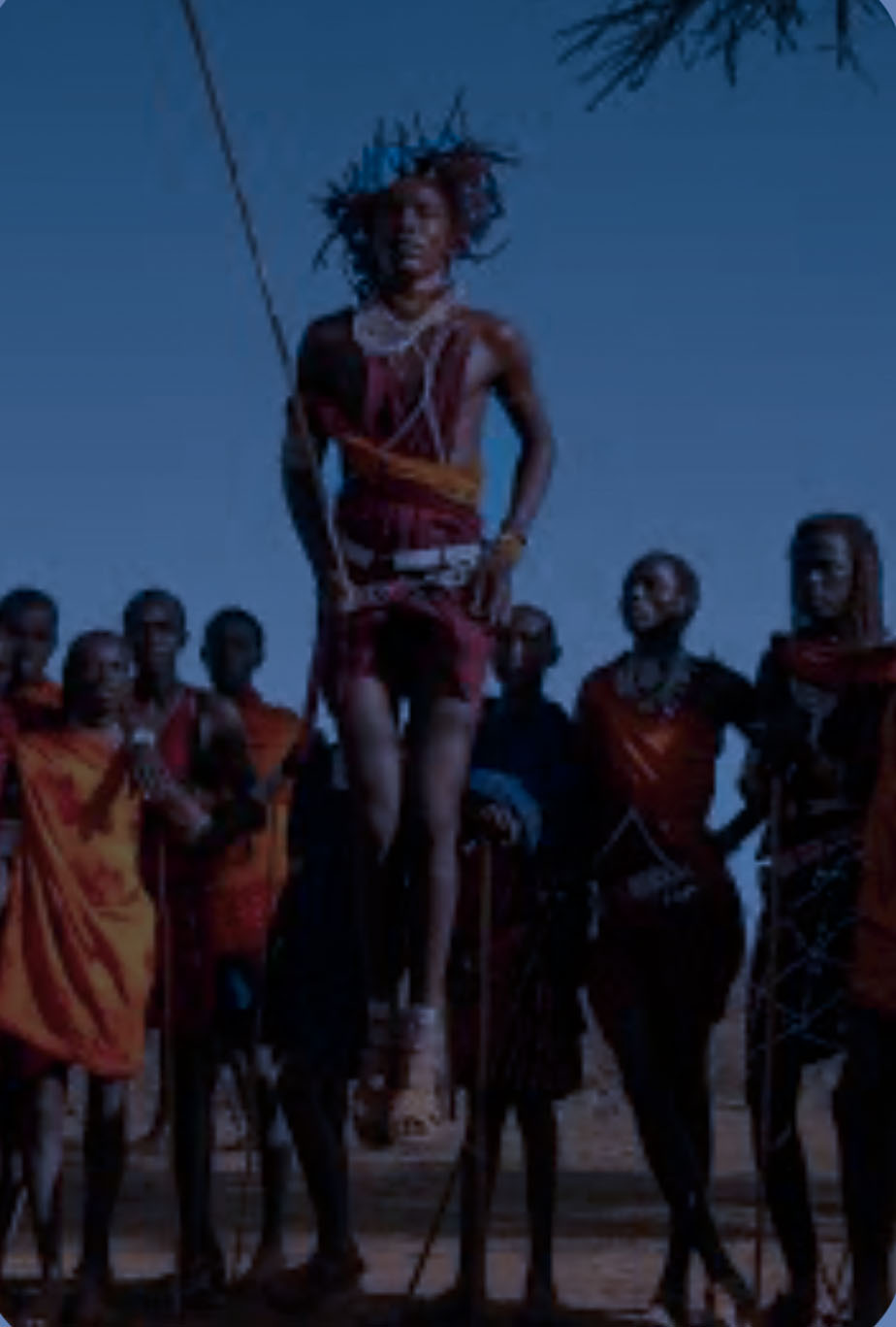 그들의 춤은 단순한 움직임 이상의 것, 마치 대지와 혼연일체가 된 듯한 몸짓이었다. 남자들은 길고 날씬한 몸을 똑바로 세우고, 어깨를 펴며 한 걸음 한 걸음 앞으로 나아갔다. 그들의 얼굴은 자부심으로 가득 차 있었고, 피부는 석양빛을 받아 붉은빛으로 빛났다. 그들이 입은 전통 의상, ‘슈카’는 붉은 색과 파란 색이 교차하며 대조를 이루었고, 바람이 불 때마다 그들의 움직임에 따라 자연스럽게 펄럭였다.