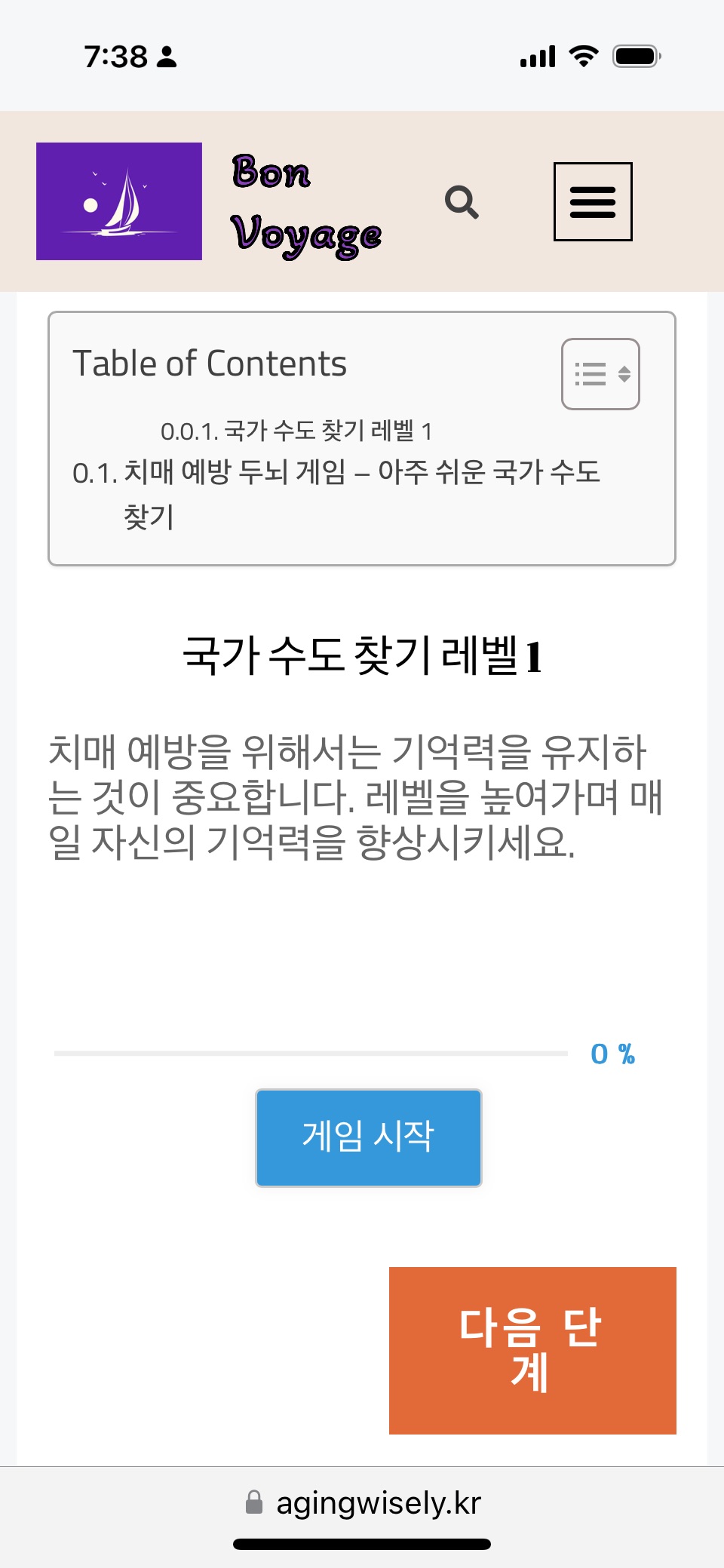 나의 상황과 정보를 바탕으로 아예 부모님이 언제나 할 수 있는 기억력 게임을 만들었다. 시인 서정주도 노년에 부인과 함께 매일 아침 전국의 산 이름 외우기를 했다지 않던가. 내가 만든 게임은 각 나라의 수도 이름 기억하기 게임이다. 5단계로 각 단계는 10개의 4지선다형 문제로 이루어져 있다. 매일 첫 단계부터 5단계까지 반복하면 기억력 훈련이 될 것이라고 생각한다. 아래 링크에서 게임은 시작된다.